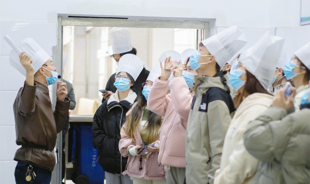 座談中,飲食服務中心負責人詳細介紹了學校食堂的基本情況、學生食堂檢查監管制度、學生訴求回復情況,并現場演示“互聯網+”明廚亮灶工程。隨后,學生代表在做好安全防護的情況下,前往食堂后廚參觀。食堂負責人從食堂的規章制度、食品安全、衛生管理、人員結構到食品的采購、儲存、出庫、加工、采樣預留、熟食售賣等諸多方面,向學生代表作了詳細解說。參觀中,學生代表認真聽、仔細看,并不時與食堂師傅們溝通交流,對后廚的規范化管理、干凈整潔的環境、食堂員工的精神風貌贊嘆不已。