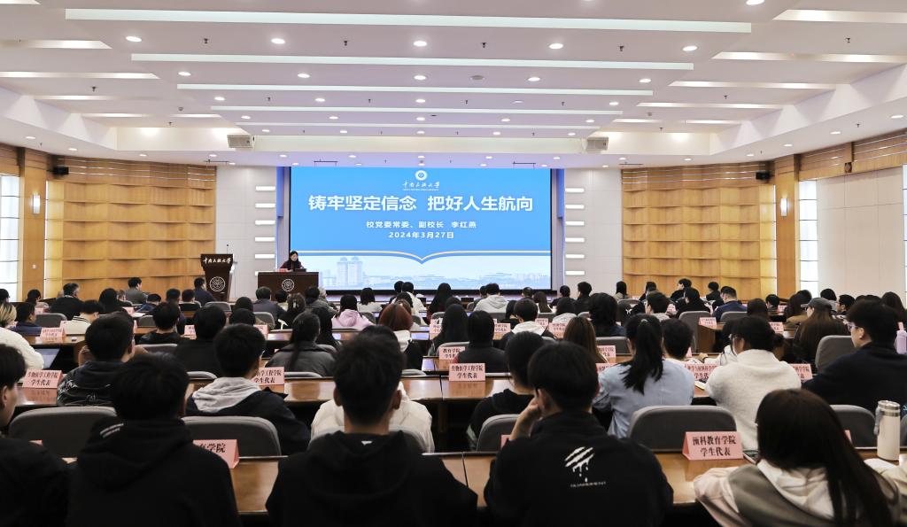 讀書不覺已春深,一寸光陰一寸金。3月27日晚,學校舉行2023級學生年級大會暨2024年春季學期開學第一課教育活動。校黨委常委、副校長李紅燕以“鑄牢堅定信念 把好人生航向”為主題授課,校黨委常委、副校長方德斌主持活動。