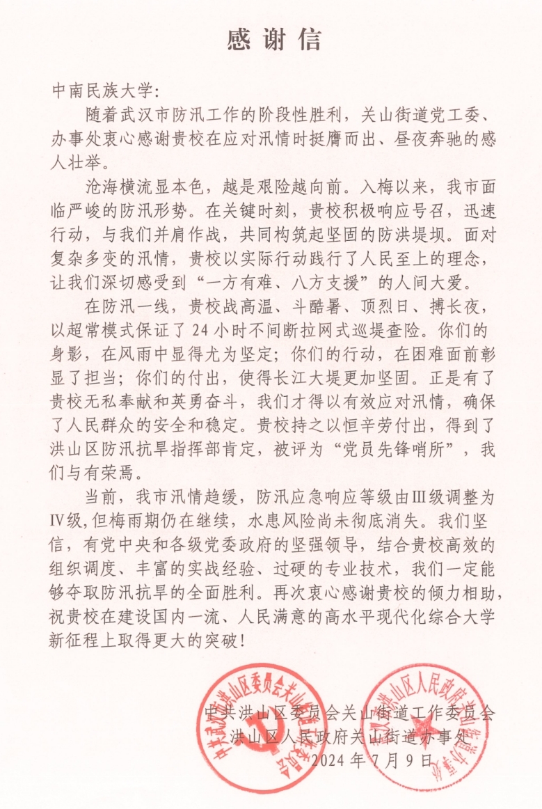 7月8日上午,經(jīng)過(guò)連續(xù)8天的持續(xù)奮戰(zhàn),長(zhǎng)江武漢段水位降至27.26米,低于警戒水位(27.30米),標(biāo)志著武漢市今年的防汛工作取得關(guān)鍵的階段性勝利。7月9日,中共洪山區(qū)委關(guān)山街道工作委員會(huì)致信學(xué)校,感謝我校教職工在應(yīng)對(duì)汛情時(shí)挺膺擔(dān)當(dāng)、晝夜奔馳。