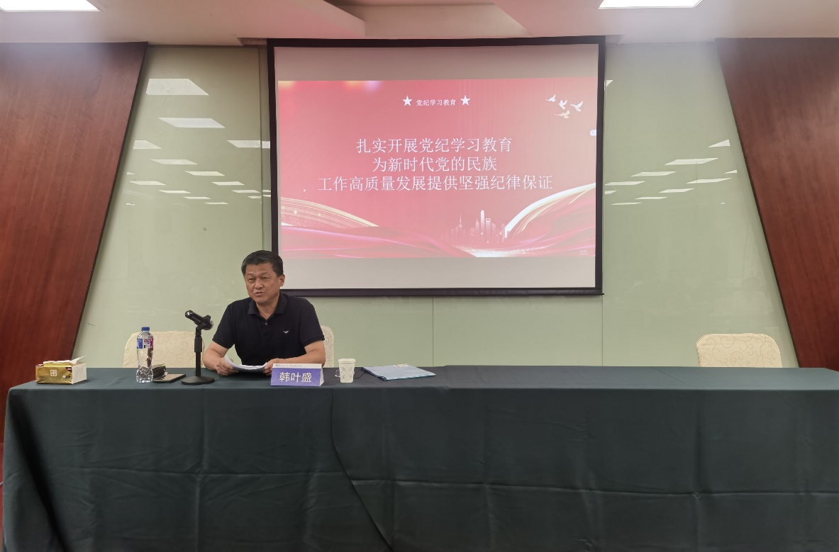 20日晚,學(xué)校黨委常委、紀(jì)委書記韓葉盛以《扎實開展黨紀(jì)學(xué)習(xí)教育 為新時代黨的民族工作高質(zhì)量發(fā)展提供堅強(qiáng)紀(jì)律保證》為題講授專題黨紀(jì)學(xué)習(xí)教育黨課。他強(qiáng)調(diào),要準(zhǔn)確把握新修訂的《中國共產(chǎn)黨紀(jì)律處分條例》的主旨要義,嚴(yán)守六項紀(jì)律,堅定擁護(hù)“兩個確立”、堅決做到“兩個維護(hù)”。他要求廣大黨員干部牢固樹立和踐行新時代正確民族觀,鑄牢中華民族共同體意識,把黨的紀(jì)律內(nèi)化為日用而不覺的言行準(zhǔn)繩,自覺抵制各類違紀(jì)違法行為,凝聚干事創(chuàng)業(yè)的精氣神,努力把黨紀(jì)學(xué)習(xí)教育成果轉(zhuǎn)化為推動新時代黨的民族工作和教育事業(yè)高質(zhì)量發(fā)展的實際行動。