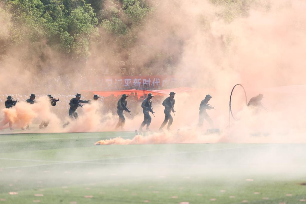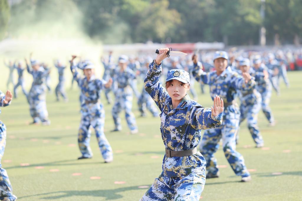 大會在莊嚴(yán)的國歌聲中拉開序幕。受閱方陣的學(xué)生邁著鏗鏘的步伐依次從主席臺前踏過。隨后,花樣方陣、匕首操、擒敵拳、刺殺操、“戰(zhàn)場”突擊等節(jié)目依次進(jìn)行匯報(bào)表演。一身戎裝展風(fēng)采,英姿颯爽致青春。參加軍訓(xùn)匯演的每位2024級同學(xué)都意氣風(fēng)發(fā),展現(xiàn)了新一屆民大學(xué)子的青春風(fēng)采和精神風(fēng)貌。