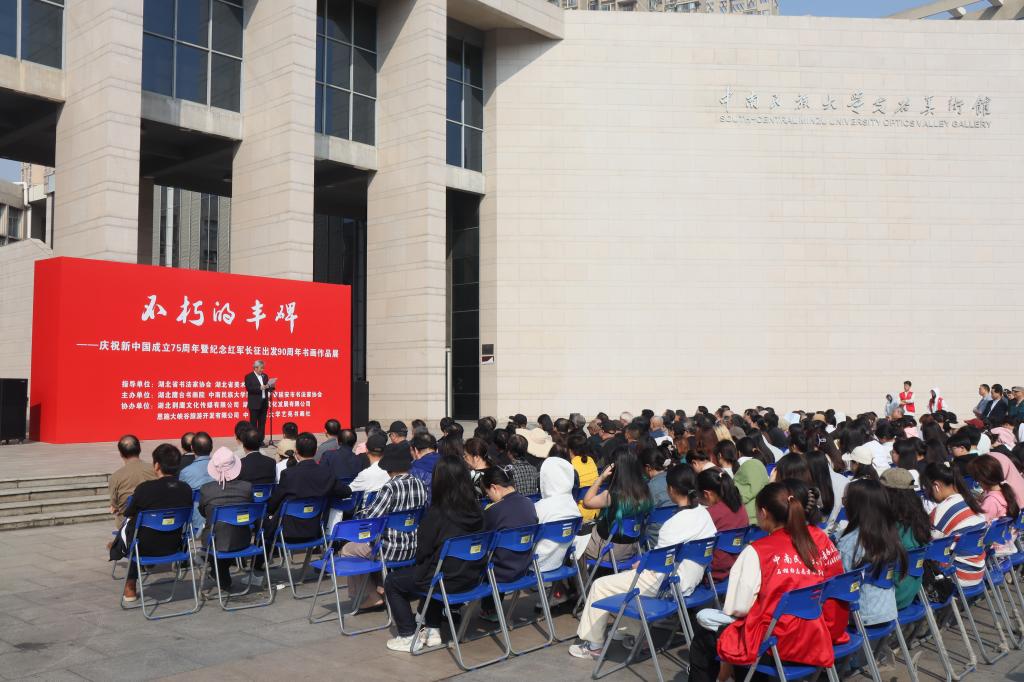 11月3日上午,由湖北省書協、湖北省美協指導,湖北鷹臺書畫院、我校團委聯合陜西省延安市書協主辦的“不朽的豐碑——慶祝中華人民共和國成立75周年暨紀念紅軍長征出發90周年書畫作品展”在我校光谷美術館開幕。校黨委常委、副校長李紅燕,校團委、美術學院等單位負責人以及師生代表300余人參加開幕式。