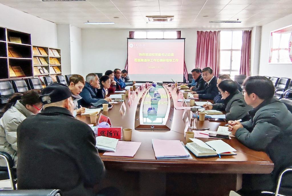 12月17日,校黨委書記邊境深入離退休工作處調研指導工作,充分了解我校離退休工作情況,聽取老同志對學校發展建議。黨政辦公室主任陳強勝、離退休工作處領導班子成員和退休教職工黨支部書記參加調研座談會。座談會由黨委組織部常務副部長、離退休工作處處長周剛主持。