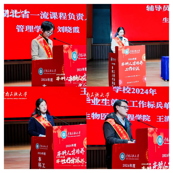 會上,管理學院劉曉霞老師代表湖北省一流本科課程負責人分享了《會計信息系統(tǒng)》課程教學改革的典型經(jīng)驗。生命科學學院李茜老師作為第十一屆湖北省高校輔導員素質(zhì)能力大賽二等獎獲獎者介紹了學生思想政治教育的創(chuàng)新思路與實踐成果。實驗教學與工程訓練中心、創(chuàng)新創(chuàng)業(yè)學院王蕾老師代表國家級學科競賽優(yōu)秀指導教師分享了帶領學生參加學科競賽的成功經(jīng)驗。生物醫(yī)學工程學院黨委副書記王清華代表學校2024年畢業(yè)生就業(yè)工作獲獎單位介紹了生醫(yī)學院上下聯(lián)動、統(tǒng)籌推進畢業(yè)生高質(zhì)量就業(yè)的工作舉措。