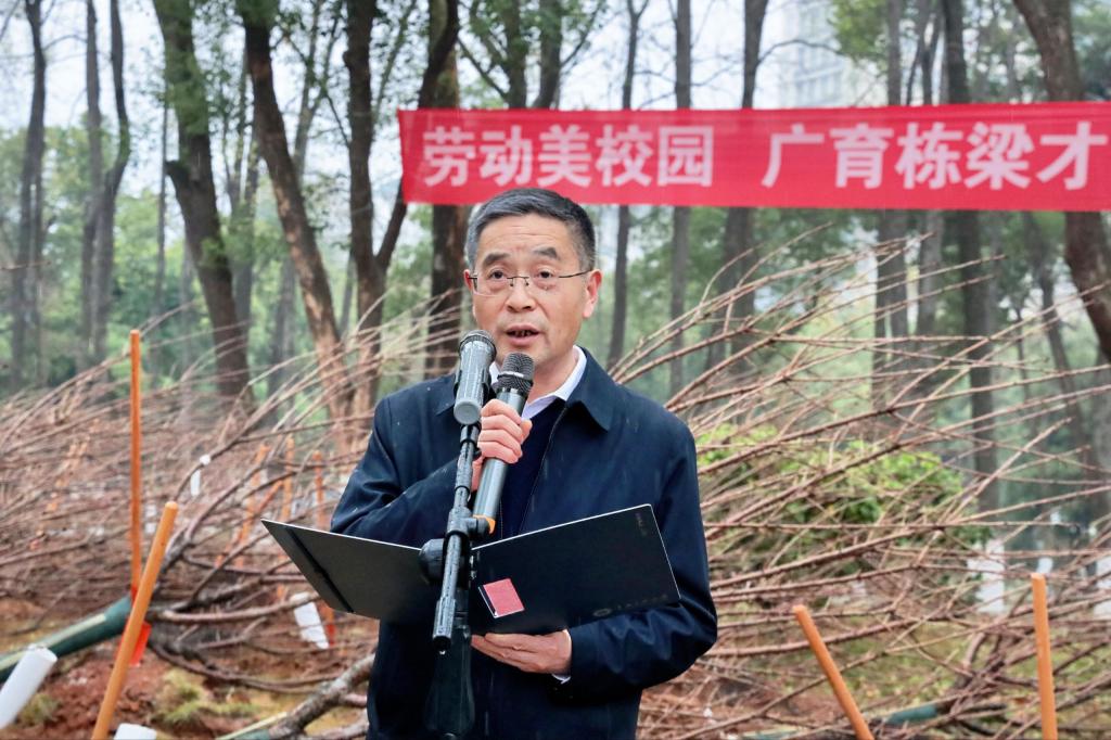校黨委副書記、校長劉義致辭。他說,青年大學生是祖國的未來,也是生態文明建設的重要力量。今天的植樹活動,不僅是一堂勞動實踐課,也是一堂生態教育課。全校師生要將“綠水青山就是金山銀山”的理念內化于心、外化于行,共同繪出美麗民大的時代新畫卷。他指出,我們今天在此栽下新苗,為石榴樹施肥培土,就是要在青年學子心中播下“民族團結”的種子,引導大家牢固樹立“休戚與共、榮辱與共、生死與共、命運與共”的共同體理念,努力成為鑄牢中華民族共同體意識的堅定擁護者、有力宣傳者和忠實實踐者。