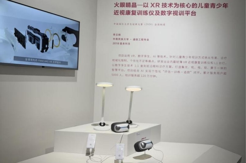 我校李云帆團隊的“數字視光——以 XR 技術為核心的兒童青少年視力訓練儀及數字視訓平臺”項目,在此次展覽中精彩亮相。該項目憑借技術原創性、社會價值與產業化潛力從全國數千個項目中脫穎而出。項目依托XR技術、數字孿生與 AI 算法,攻克傳統視訓場景受限、依從性低等痛點,打造國內首個“All in one數字視訓平臺”,突破硬件依賴,構建“軟件定義視光”的新范式,擁有了數字孿生復刻診療方案、輕薄化硬件設計、底層算法庫集成、智能中臺實時分析等創新成果。項目通過生物指標分析實現“千人千面”訓練方案,同時,VR 游戲化訓練提升了兒童參與度,數字平臺打破了醫療資源地域壁壘,展現了巨大社會價值。目前已累計服務超5000名用戶,訓練時長突破120萬分鐘。