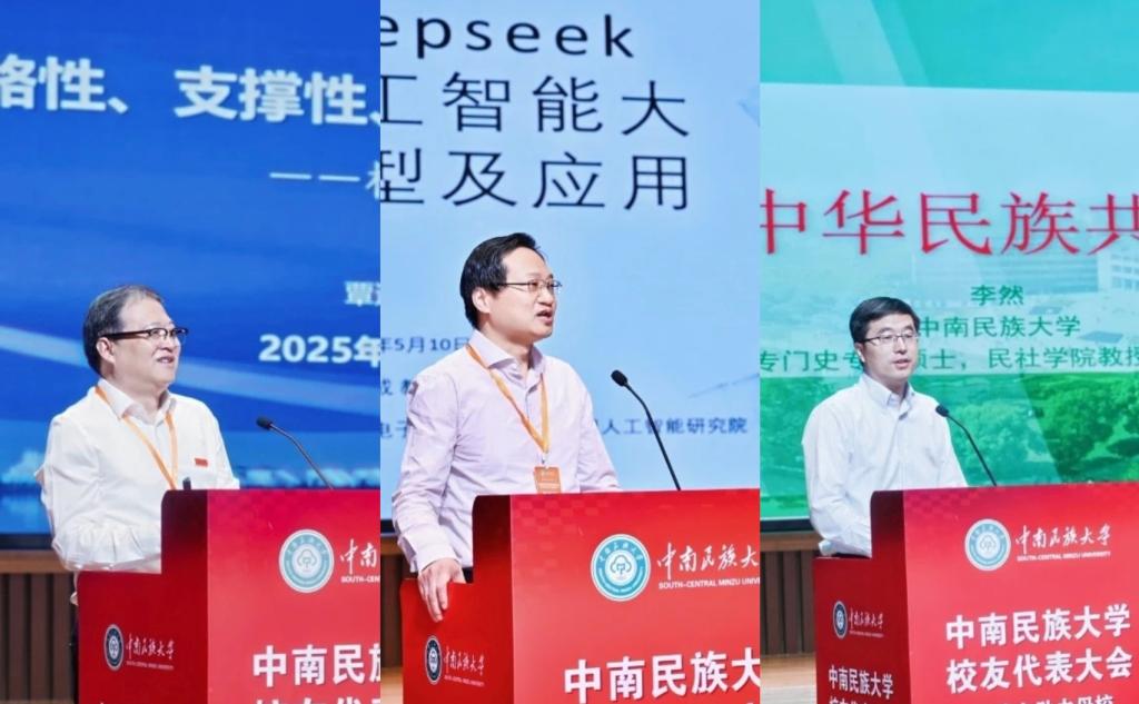 大會期間,還進行了校友分享環節,分享環節由覃瑞主持。1984級歷史專業校友、江漢大學黨委書記、湖北省社科聯副主席覃道明圍繞“戰略性、支撐性、不可替代性——一流學科的標識性特征”,對學校一流學科建設提出自己的見解;1998級生物醫學工程學院校友、桂林電子科技大學中國東盟人工智能研究院副院長楊巨成,結合“Deepseek人工智能大模型及應用”,為學校學科建設借助人工智能力量提供了新思路;2002級專門史專業碩士校友、學校民族學與社會學學院教授李然以鑄牢中華民族共同體意識為題,為校友們在工作生活中鑄牢中華民族共同體意識提供了指引。