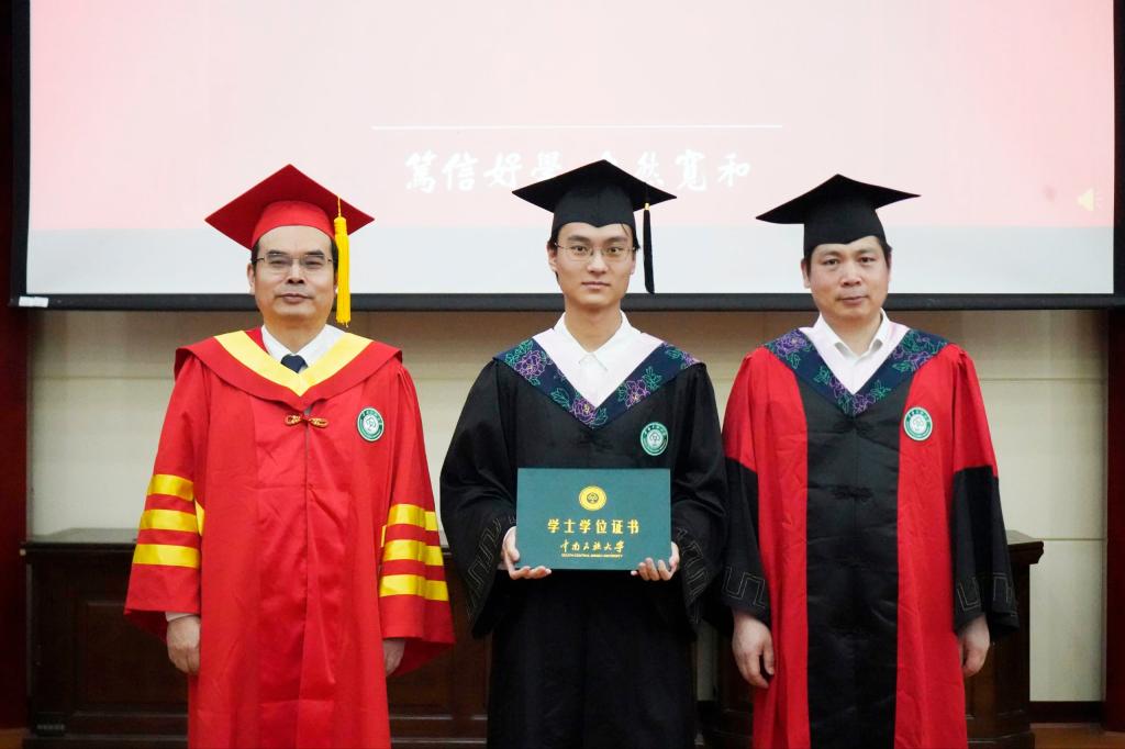 校黨委副書記、校長劉義為生物醫(yī)學工程學院畢生生行“撥穗禮”、授學位后合影。生醫(yī)學院供圖