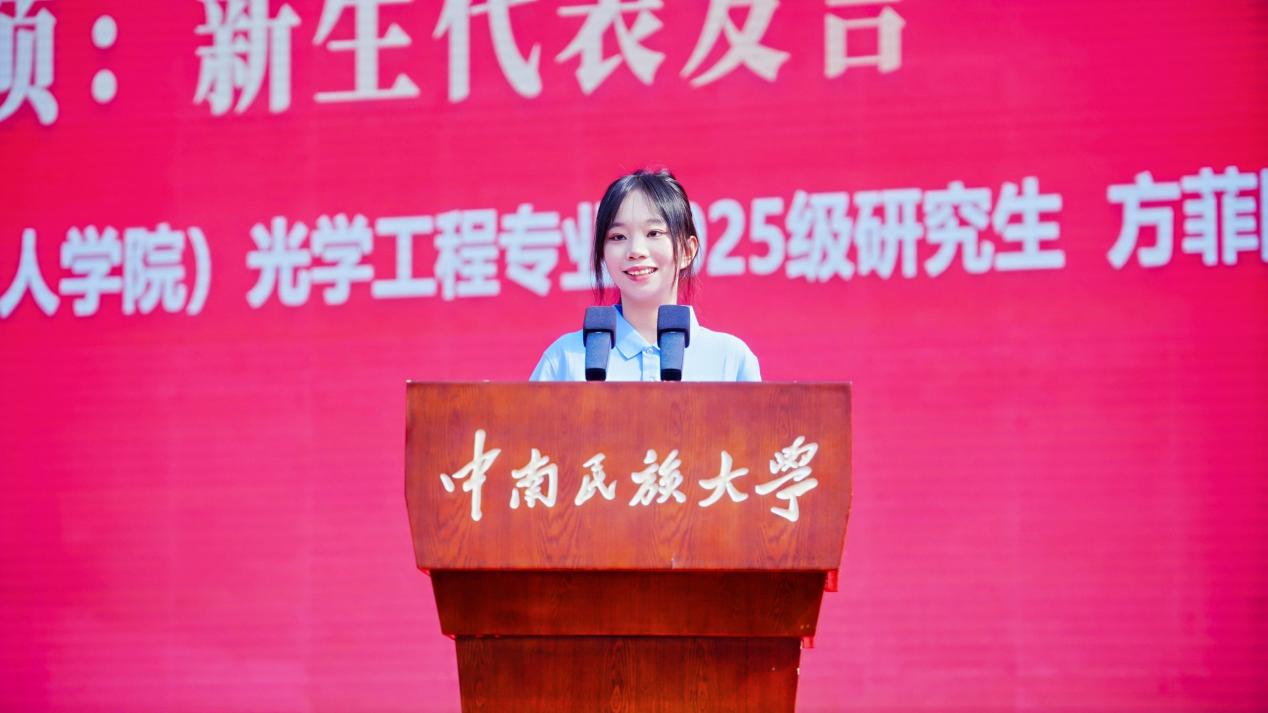 新生代表、電子信息工程學院(機器人學院)2025級光學工程專業研究生方菲表示,將扎根專業領域,以科技創新服務國家發展,希望同學們以青春之我、奮斗之我,為牢不可破的中華民族共同體建設貢獻力量。