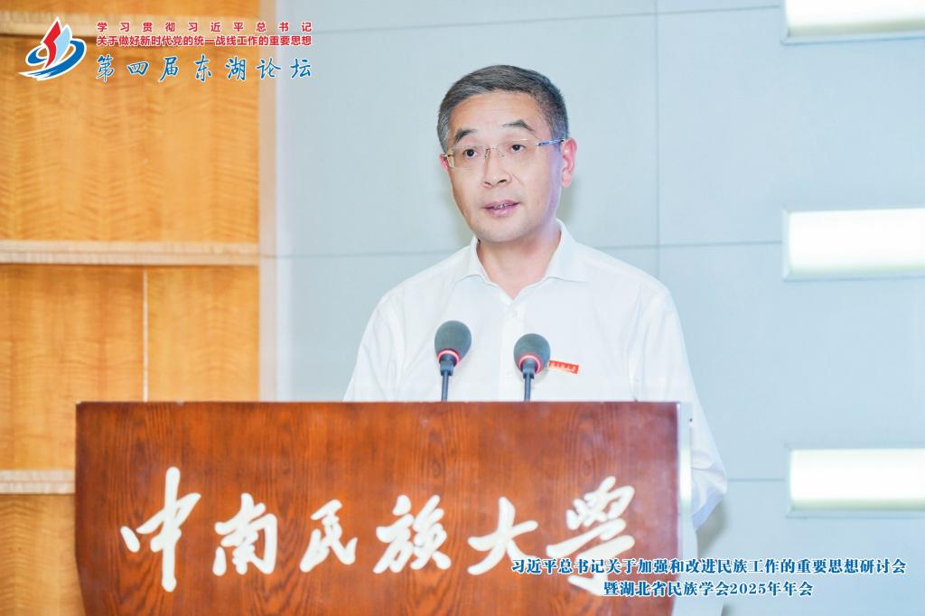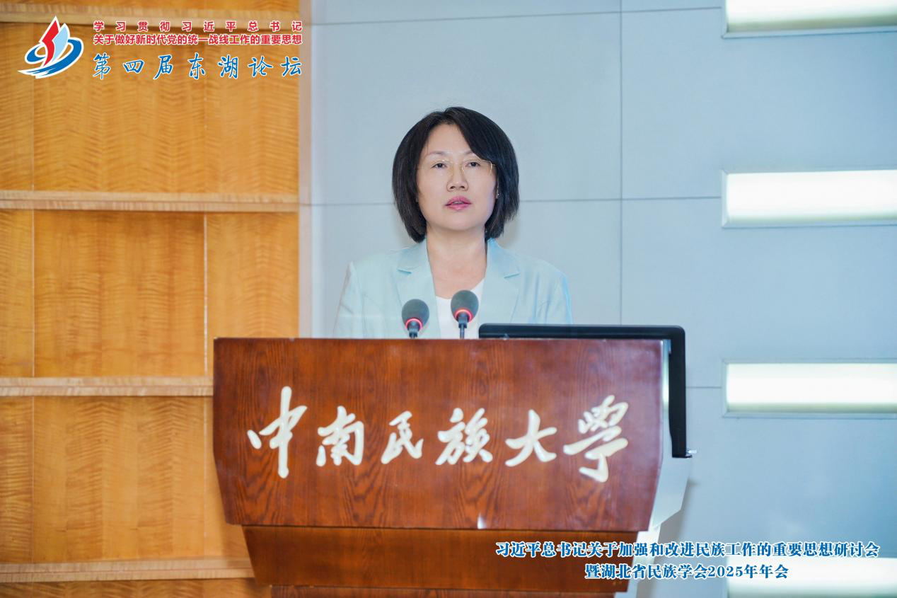 9月16日,第四屆東湖論壇·習(xí)近平總書記關(guān)于加強和改進(jìn)民族工作的重要思想研討會暨湖北省民族學(xué)會2025年年會在我校學(xué)術(shù)交流中心舉行。本次論壇由湖北省民族宗教事務(wù)委員會主辦,湖北省民族學(xué)會和我校國家安全學(xué)院承辦。國家民委理論研究司二級巡視員陳曉嫚,湖北省委統(tǒng)戰(zhàn)部副部長、省民宗委黨組書記趙少蓮,湖北省民族學(xué)會會長吳紅婭,我校黨委副書記、校長劉義等領(lǐng)導(dǎo)出席開幕式和總結(jié)會,相關(guān)領(lǐng)域知名專家學(xué)者及地方干部代表齊聚一堂。論壇開幕式由我校黨委常委、副校長方德斌主持。