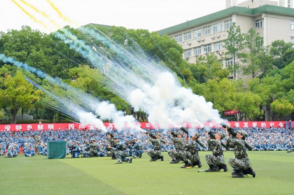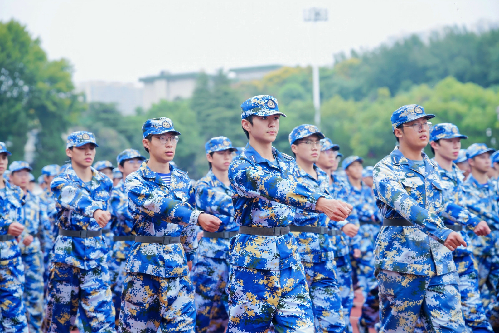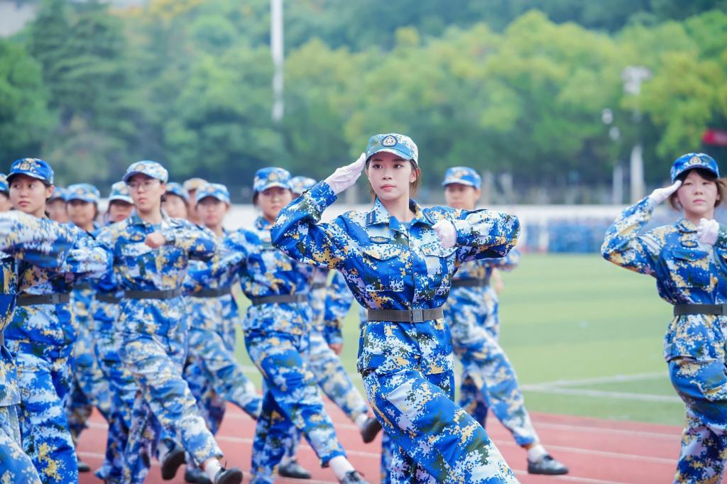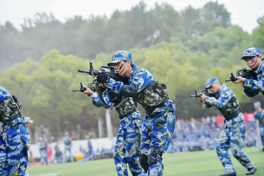 在極具感染力的滾動(dòng)排字表演中,1200名參訓(xùn)學(xué)子依次展示出黨徽、“紀(jì)念抗戰(zhàn)勝利80周年”、“正義必勝、和平必勝、人民必勝”、校徽以及校訓(xùn)“篤信好學(xué),自然寬和”等字樣。他們動(dòng)作整齊劃一,默契配合,依次傳遞,最終共同展開一面鮮紅的五星紅旗,并莊嚴(yán)許下“請(qǐng)黨放心,強(qiáng)國(guó)有我”的青春誓言。隨后,刺殺操、匕首操、軍體拳、紅藍(lán)對(duì)抗、隊(duì)形變換等軍事訓(xùn)練科目依次亮相。學(xué)員們動(dòng)作剛勁有力、氣勢(shì)如虹,全面展現(xiàn)了為期兩周的軍訓(xùn)成果,贏得現(xiàn)場(chǎng)陣陣掌聲。