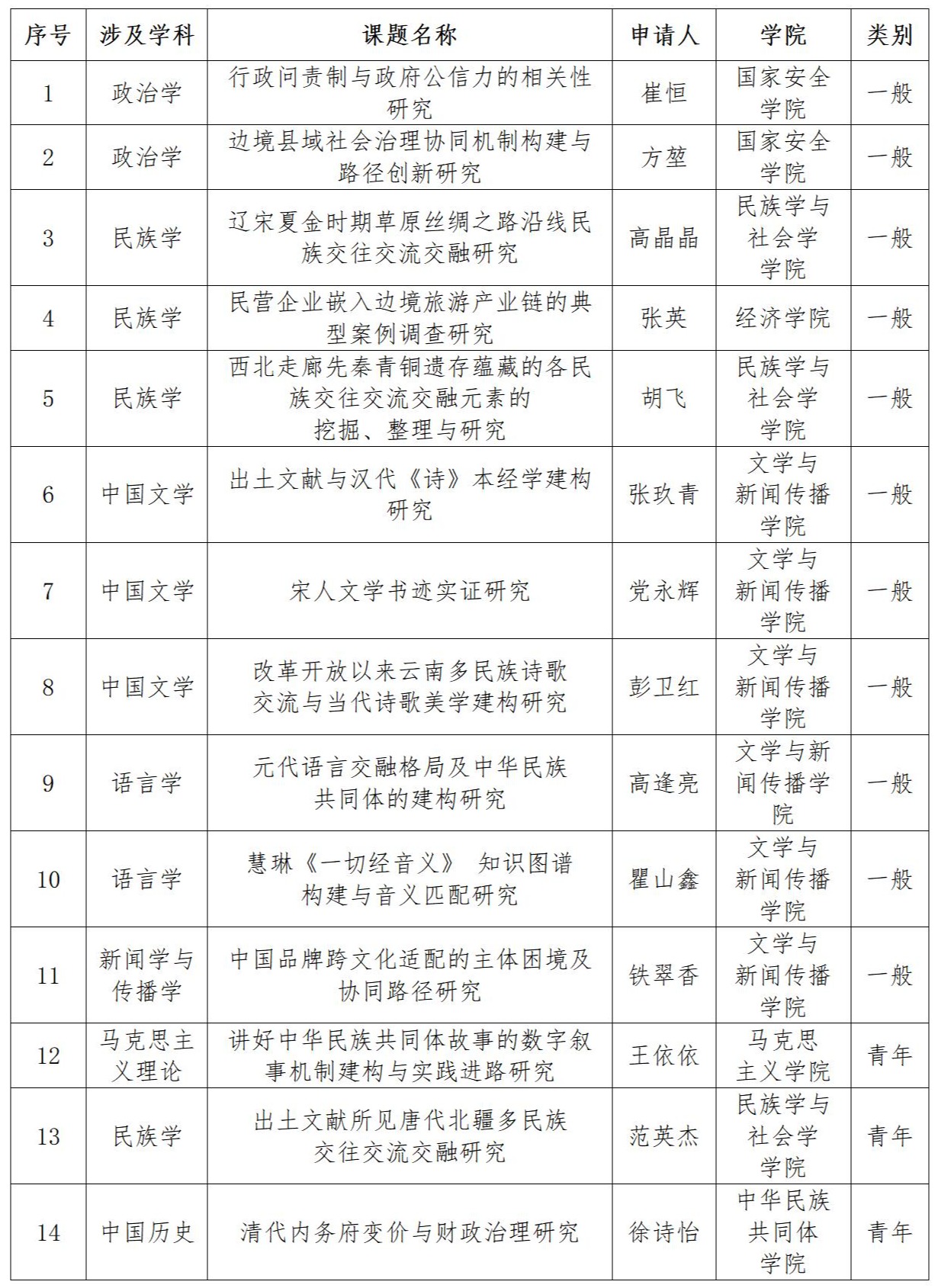 本次國家社科基金年度項目立項項目覆蓋7個學科,其中,民族學獲批立項4項,中國文學獲批立項3項,語言學、政治學各獲批立項2項,馬克思主義理論、新聞學與傳播學、中國歷史各獲批立項1項。