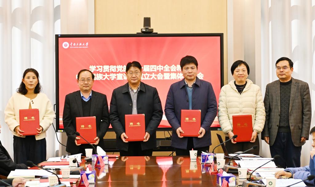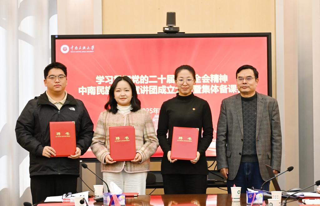 會(huì)上,馬玉堂傳達(dá)學(xué)習(xí)了國家民委黨組、湖北省委關(guān)于學(xué)習(xí)貫徹黨的二十屆四中全會(huì)精神的相關(guān)文件精神,宣讀了學(xué)校宣講團(tuán)、“銀齡”宣講團(tuán)、青年學(xué)生宣講團(tuán)成員名單。徐業(yè)勤為學(xué)習(xí)貫徹黨的二十屆四中全會(huì)精神中南民族大學(xué)宣講團(tuán)成員頒發(fā)聘書。