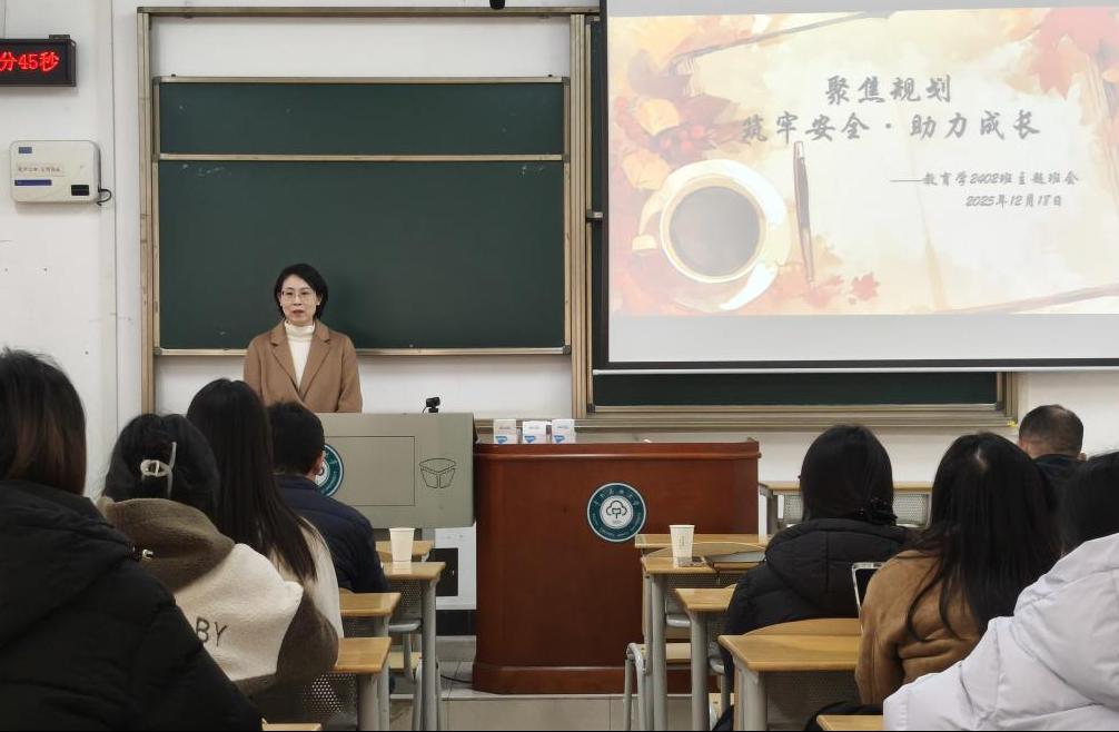 12月18日,校黨委常委、總會(huì)計(jì)師包莉娜參加教育學(xué)2402班“聚焦規(guī)劃·筑牢安全·助力成長(zhǎng)”主題班會(huì)。教育學(xué)院班子成員、輔導(dǎo)員、班導(dǎo)師與教育學(xué)2402班全體同學(xué)共同完成這場(chǎng)兼具思想深度與實(shí)踐意義的成長(zhǎng)交流會(huì)。
