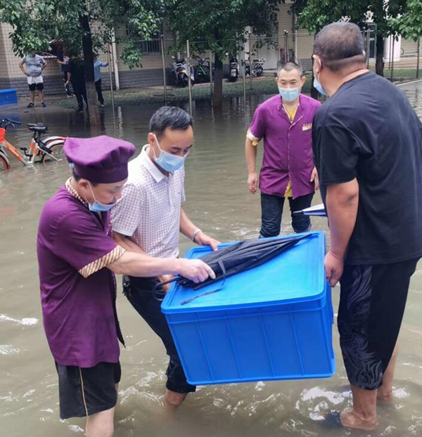 29日上午,北區學生公寓出現嚴重漬水,校園環境服務中心緊急搭建浮橋,放入小舟,擺渡學生進出。飲食服務中心則涉水將就餐物資自南區食堂轉運到北區食堂,讓同學們及時安全就餐。暴雨過后,后勤保障處還對漬水地段進行了嚴格消殺。