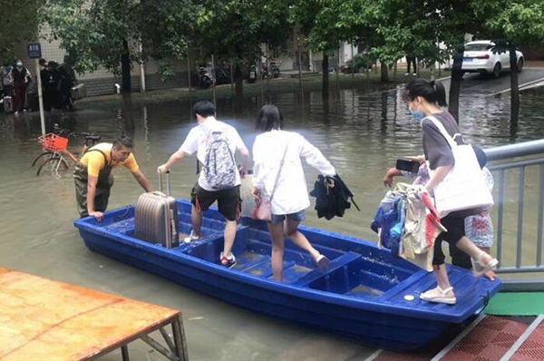 入梅以來,武漢市連日多雨,6月28日至29日上午,普降特大暴雨,畢業生返校路艱難而又溫馨。29日,校黨委副書記、副校長宋發軍和學工部、校團委老師親往火車站,迎接最后一批返校的畢業生。住北區學生公寓的同學自南區走過天橋,映入眼簾的是一條藍色的小舟,后勤保障處的師傅挽舟涉水,送他們前往寢室。這是我校防澇抗洪工作的一個縮影。