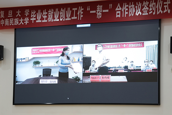 尹冬梅、宋發軍分別代表兩校簽訂《復旦大學-中南民族大學畢業生就業創業工作“一幫一”行動幫扶協議》,實現兩校就業創業“一對一”幫扶合作“云簽約”“云握手”。