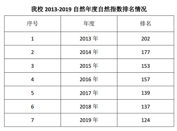 我校2013-2019自然年度自然指數(shù)排名情況。科學(xué)研究發(fā)展院供圖