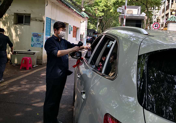 學校14個臨時黨支部積極響應,志愿者紛紛報名參加學校門崗值守工作。一時間,四百余位志愿者按照排班分批分時段有序在學校門崗值班,嚴格仔細地做好出入校園人員、車輛的信息登記、證件審查、體溫測量、群眾勸導等工作。對前來門口領取藥品、生活物資和快遞的人員,志愿者們也耐心細致地引導大家有序領取物資,并提醒大家保持距離,排隊等待?!懊翊笫俏壹遥S護社區安全,做好志愿服務是理所當然的?!眲倓偨o學生上完網課的一位老師在門崗開始志愿服務,對進出校園的車輛進行疏導。