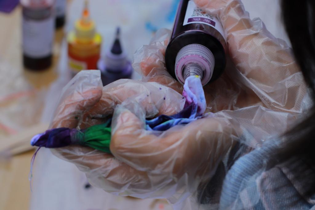 而同樣來自經(jīng)濟(jì)學(xué)院的大三學(xué)生陳丹妮則向記者展示了自己手上的“扎染”成果。在白族展區(qū),負(fù)責(zé)扎染活動(dòng)的學(xué)生正在向現(xiàn)場師生演示扎染流程,“選用棉麻布料并卷曲折疊,用細(xì)繩緊緊纏繞,如果想做出不同花樣也可以在布料中包裹進(jìn)道具。”演示學(xué)生指了指手邊的彈珠,“用板藍(lán)根染液染色,促進(jìn)暈染效果一般用染缸密封,我們也可以用塑料袋代替,最后再清洗,用固色劑固定顏色即可。”