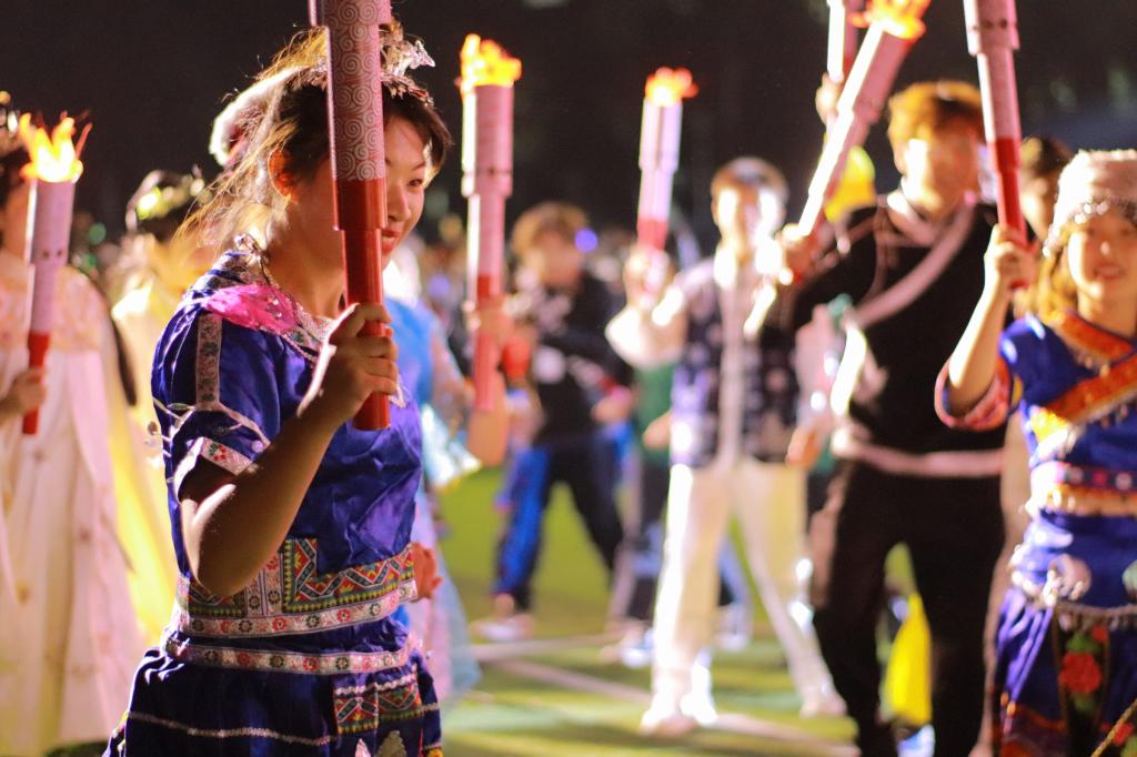 當(dāng)晚,作為“民大節(jié)”晚會(huì)的固定環(huán)節(jié)火炬?zhèn)鬟f,在最后環(huán)節(jié)掀起了高潮,參與白天展演的各民族學(xué)生依次傳遞火炬,最后13個(gè)民族火炬手一同點(diǎn)燃篝火,寓意薪火相傳,生生不息。