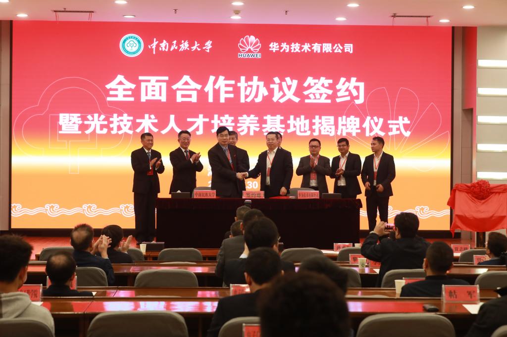 10月30日上午,中南民族大學(xué)-華為技術(shù)有限公司全面合作協(xié)議簽約暨光技術(shù)人才培養(yǎng)基地揭牌儀式在我校舉行。華為技術(shù)有限公司湖北政企業(yè)務(wù)部總經(jīng)理孫承奎、副總經(jīng)理賈志峰,光產(chǎn)品線總監(jiān)孫偉、教育行業(yè)總經(jīng)理閆忠輝、政企人才生態(tài)經(jīng)理史琳波,校黨委書記邊境,校長(zhǎng)李金林,校黨委副書記白江源,校黨委常委、紀(jì)委書記韓葉盛,相關(guān)職能部門負(fù)責(zé)人,電信學(xué)院、計(jì)科學(xué)院、數(shù)統(tǒng)學(xué)院、生醫(yī)學(xué)院負(fù)責(zé)人及師生代表參加活動(dòng)。活動(dòng)由白江源主持。