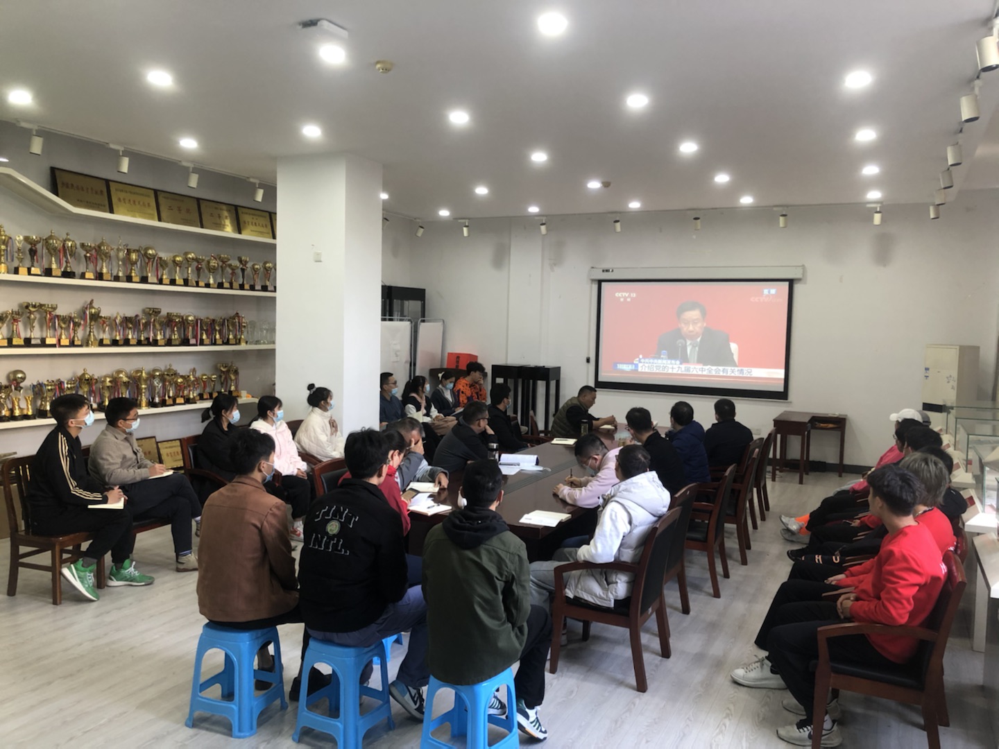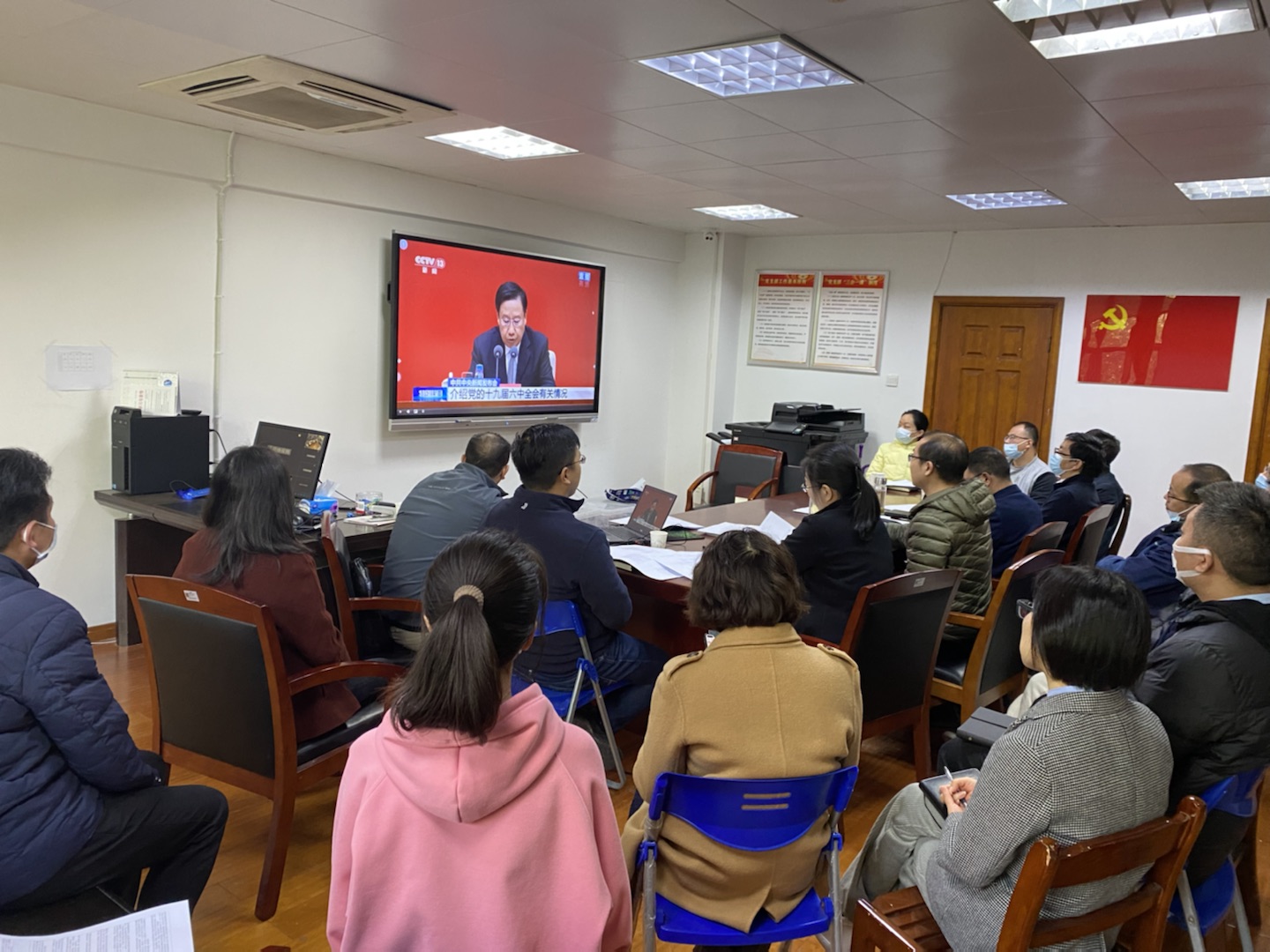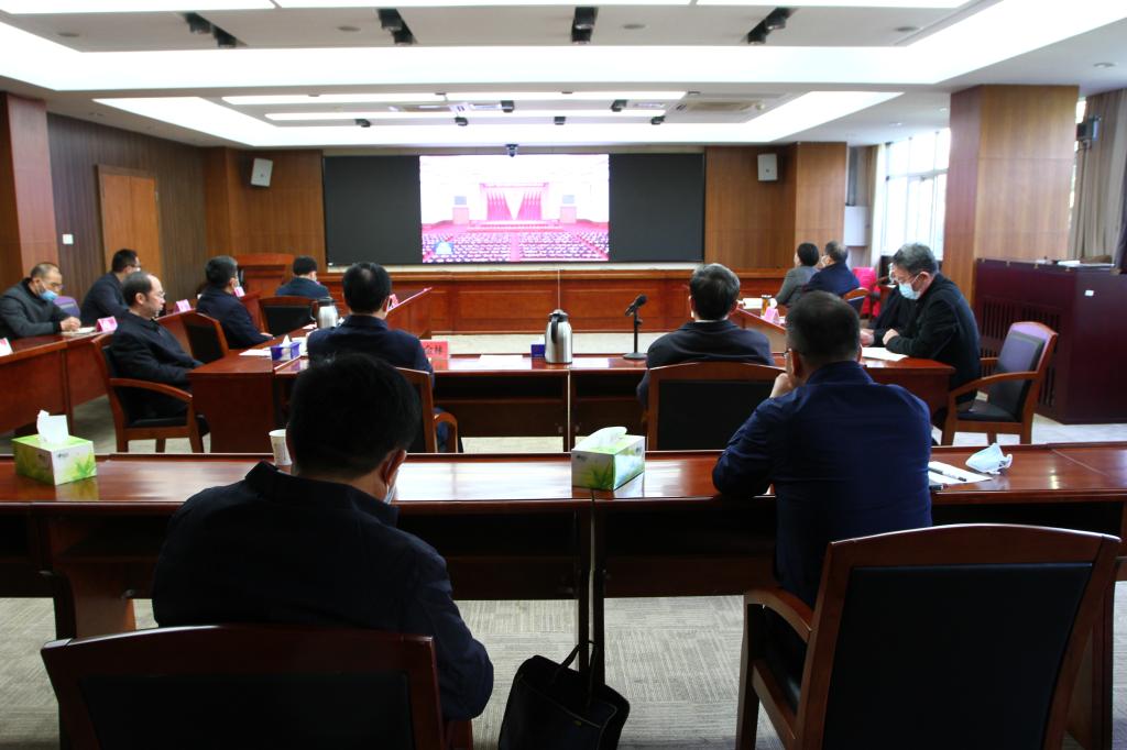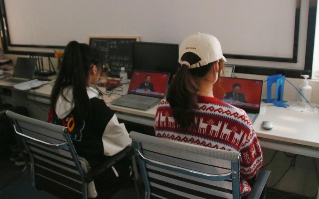 學校黨委集中收聽收看并認真學習會議精神。楊心如 攝