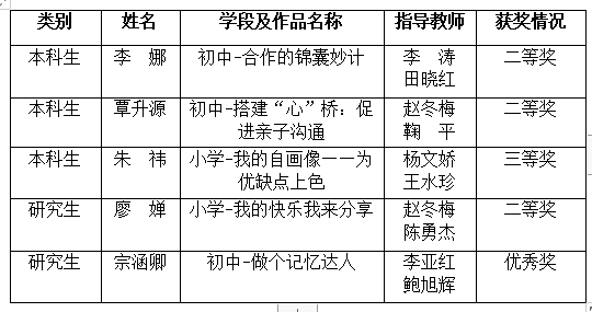 10月31日,湖北省大學(xué)生/研究生心理輔導(dǎo)課教學(xué)競賽落下帷幕,我校參賽的5名教育學(xué)院同學(xué)取得本科生組二等獎(jiǎng)2項(xiàng)、三等獎(jiǎng)1項(xiàng),研究生組二等獎(jiǎng)與優(yōu)秀獎(jiǎng)各1項(xiàng)的優(yōu)異成績,展示了教育學(xué)院應(yīng)用心理學(xué)省級一流專業(yè)建設(shè)的成果。