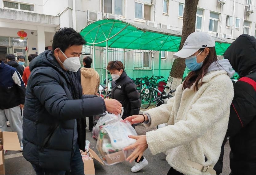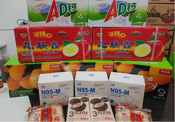 在慰問現場,同學們高興地從老師手中接過了愛心禮包。禮包里既有防疫急需的N95口罩,也有補充能量的零食、飲料和水果。