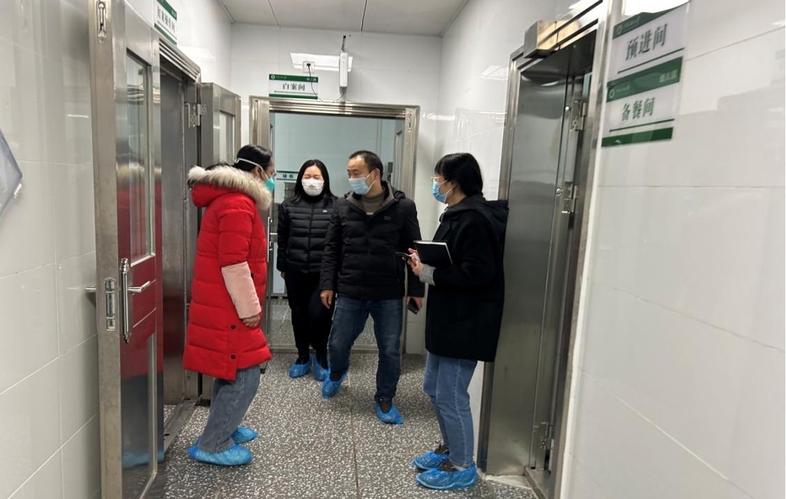 魏友生(右二)檢查幼兒園食堂各操作間。 夏小花攝