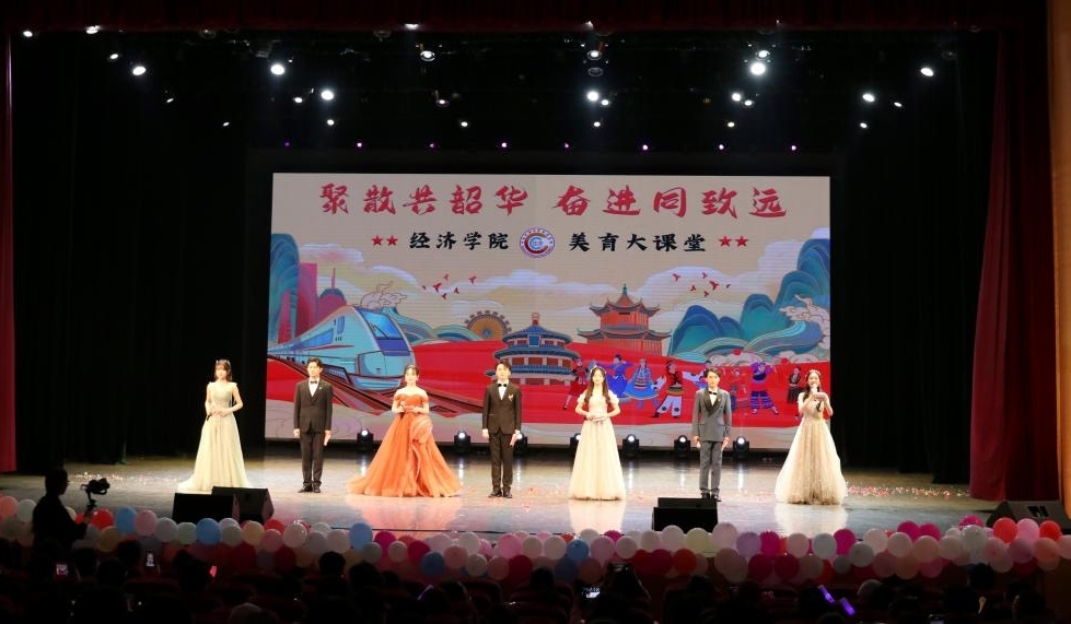 聚散有時,全體師生凝心聚力書寫抗疫大愛無疆;奮進致遠,經濟學院寄予莘莘學子美好祝愿。美育大課堂在活力四射的開場舞中拉開帷幕。歌曲《我的名字》《記念》《克卜勒》《玫瑰少年》《不為誰而作的歌》唱出青年朝氣,展現(xiàn)青春活力;街舞《青春飛揚》、齊舞《HELLO》、器樂《樂隊表演》以自信昂揚的青春風貌贏得在場觀眾的陣陣歡呼;民樂演奏《生生世世愛+尋一個你》樂聲清揚悠遠,演繹出民族樂器的獨特風情;朗誦《永不消逝的聲音》深情歌頌了中國共產黨人櫛風沐雨、砥礪前行的奮斗精神;民舞《阿杰魯》《盛開》將舞者柔美的身姿化作紙筆,書寫青年人不畏艱難、頑強生長的時代精神;由全體表演者合唱的《星辰大海》蘊含對未來的無限憧憬,表達了對祖國與人民的真切祝福。