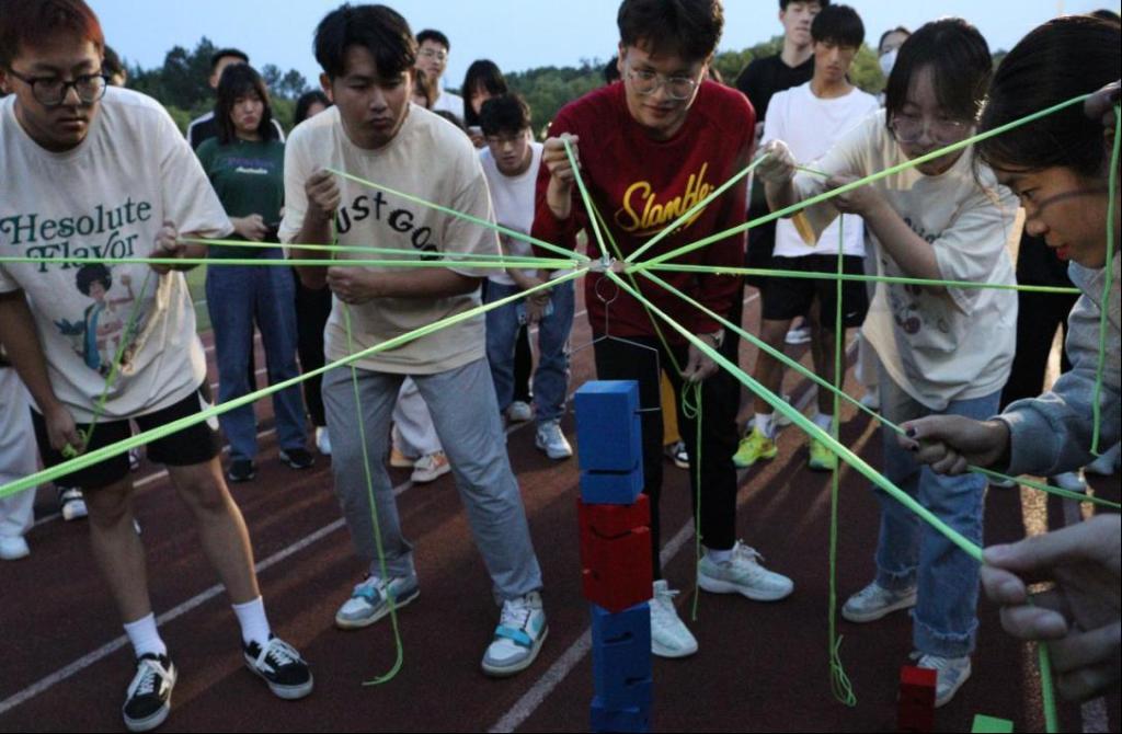 團日活動精彩紛呈,高潮迭起?!叭の栋魏印?,各團支部鉚足一股勁,擰成一股繩,激烈角逐,“繩”采飛揚;“珠行萬里”,同學們一彎一拾,小球穿越于眾人的“股掌”間,劃過的每一道痕跡,丈量著彼此“心”的間距;“一圈到底”,同學們手挽手、肩并肩,呼啦圈越過頭頂的弧線,透出青春底色,奏響團結樂章;“合力搭搭”,十繩連心,呼吸與共,同學們俯身撐繩,屏息凝神,合力搭建起一幢幢“青春”的高樓。