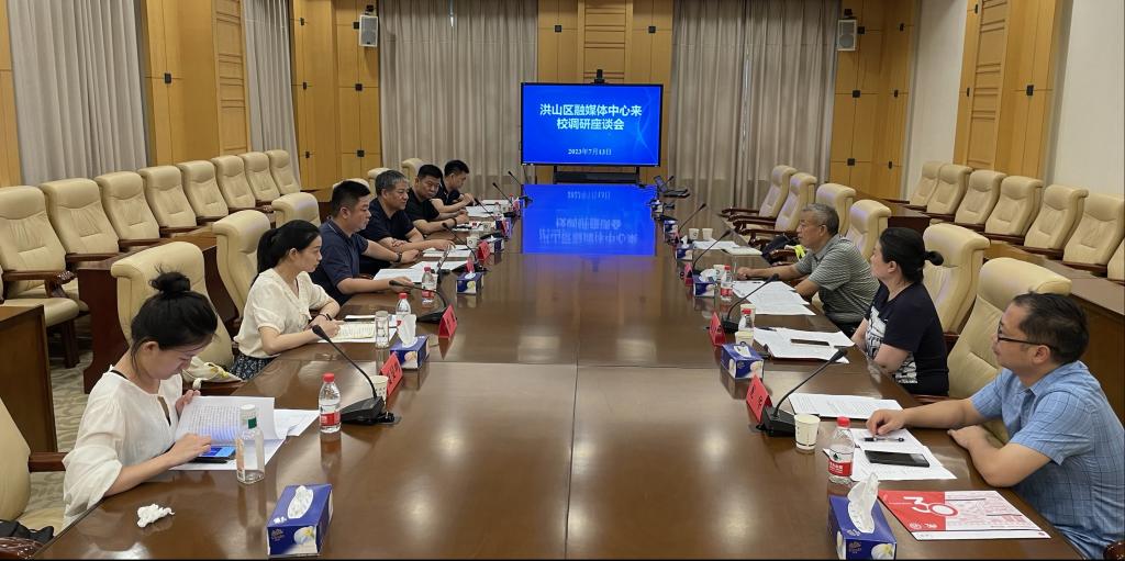 為加強(qiáng)區(qū)校新聞宣傳深度融合,提升新聞輿論傳播力、引導(dǎo)力、影響力、公信力,7月13日下午,武漢市洪山區(qū)融媒體中心主任蔡慶、副主任楊學(xué)軍一行來校調(diào)研。調(diào)研座談會(huì)在學(xué)術(shù)交流中心召開,黨委宣傳部常務(wù)副部長王懷崗主持會(huì)議。