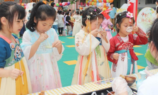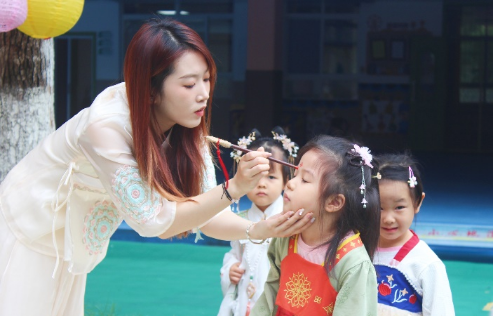 一系白衣,一裝唐裙,幼兒園里瞬間冒出一群多彩繽紛的小朋友來。他們手握玉兔花燈,輕拂圓月畫扇,井然有序地排隊踱步到操場。看著古風古韻的活動布置,小朋友們難耐內心的好奇與激動,紛紛和身邊的小伙伴分享新發現。“快看!老師在他額上畫畫呢!”“喔噢!好好看,那不是畫畫。”活動的第一個環節就是老師給小娃娃們點朱砂。“痣”通“智”,點上朱砂痣,既是對小朋友們寄托美好聰穎的愿望,也為古風古韻的氛圍增添了一筆靈動。