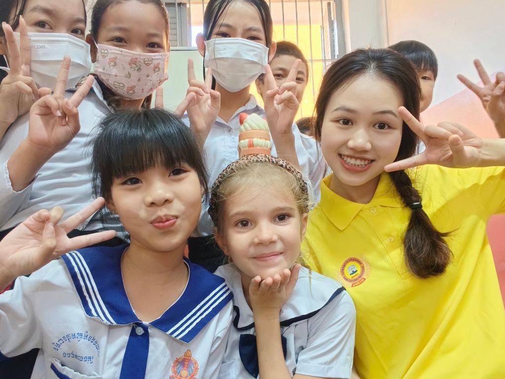 我校志愿者(右一)在馬德望聯(lián)華學(xué)校和學(xué)生共度中秋。 國際教育學(xué)院供圖
