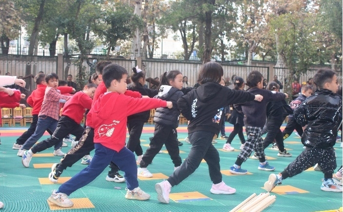 隊(duì)伍全員到位后運(yùn)動(dòng)會(huì)正式開幕,由大中班所有小朋友帶來的武術(shù)表演、舞旗表演贏得聲聲喝彩,園外家長們也是為孩子們加油鼓掌,捕捉孩子們的精彩成長瞬間。