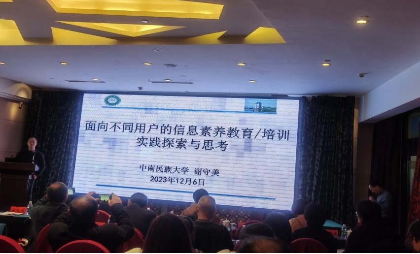 本次會議的主題是“數智賦能新時代高校圖書館高質量發展”。館員數字素養培訓主要圍繞面向數字化轉型的信息素養教育的變革、數字素養教育的規劃與實施路徑、高校圖書館數字素養教育現狀分析及實踐探索、新信息環境對數字素養教育的影響等4個方面進行。謝守美應邀作了題為《面向不同用戶的信息素養教育/培訓實踐探索與思考》的學術報告。