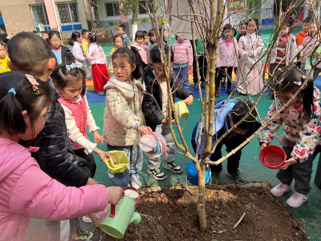 清晨,學校幼兒園的小朋友拿著小鏟子用植樹開啟了新的一天。小朋友們在老師的帶領下來到園內的空地處,拿著自己的工具挖土刨坑,把樹苗放進樹坑中,填土澆水,修建樹葉。幼兒園李美菊老師說:“前段時間,武漢剛剛經歷過凍雨災害,小朋友們親自參與到植樹活動中,不僅可以對自然現象有一個更深刻的了解,同時也激發了孩子們保護環境的意識。除此之外,共植石榴樹,也將鑄牢中華民族共同體的意識深深植入孩子們的心中,讓各民族人民如同石榴籽一樣緊緊抱在一起。”