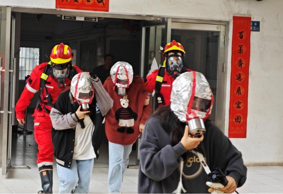 “現在我們收到消息,有兩名學生被困火場,我們的義務消防隊隊員立刻穿戴氧氣瓶和防煙面罩,準備進場救人。”在疏散演習中,只見3A學生公寓濃煙滾滾,消防員駕駛著消防車從遠處駛來,迅速穿戴消防裝備沖入火場,成功營救出被困人員及“傷員”。疏散演習環節通過使用煙霧彈、拉響警報、消防車進場出水、醫護人員搶救“傷員”等方式模擬真實火災場景,引起師生陣陣驚呼,現場氛圍濃厚。參與活動的師生反應迅速,嚴格按照應急逃生路線有序疏散,用衣服等物品捂住口鼻,低姿、快速穿越煙霧區,順利到達安全區域。疏散演練后,保衛部人員就撥打消防應急電話、應急處置流程、消防經典案例等方面為師生講解了相關消防安全知識。