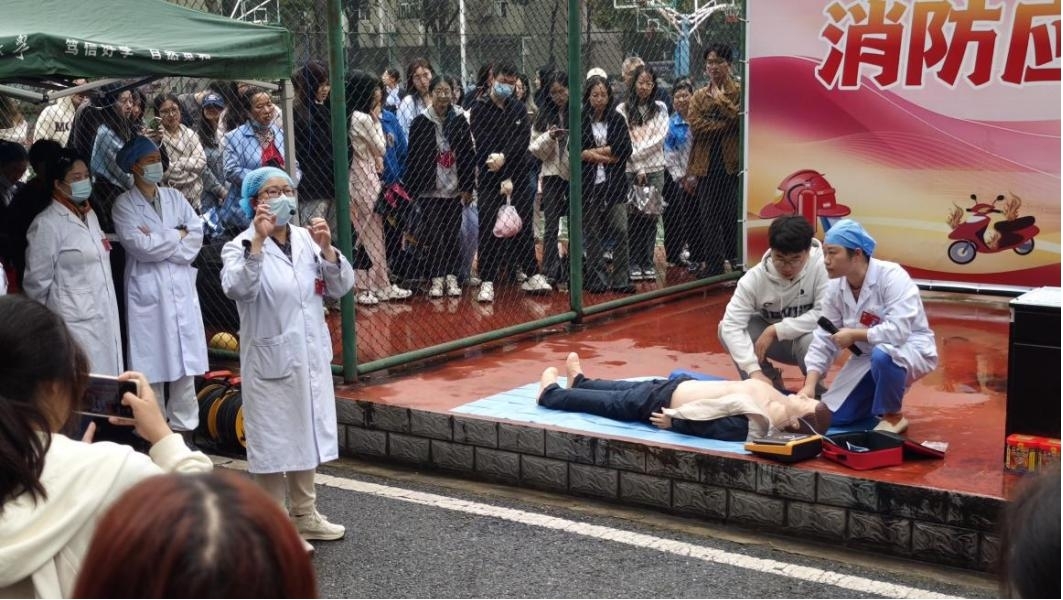 “1001、1002、1003——患者意識喪失,現在時間是下午兩點半,幫忙呼叫120”,醫護人員在現場對模擬“傷員”的人偶模型進行緊急心肺復蘇搶救的同時,面向師生詳細講解了心肺復蘇要領和自動體外除顫器(AED)的使用方法。現場大量師生參與學習并積極互動。