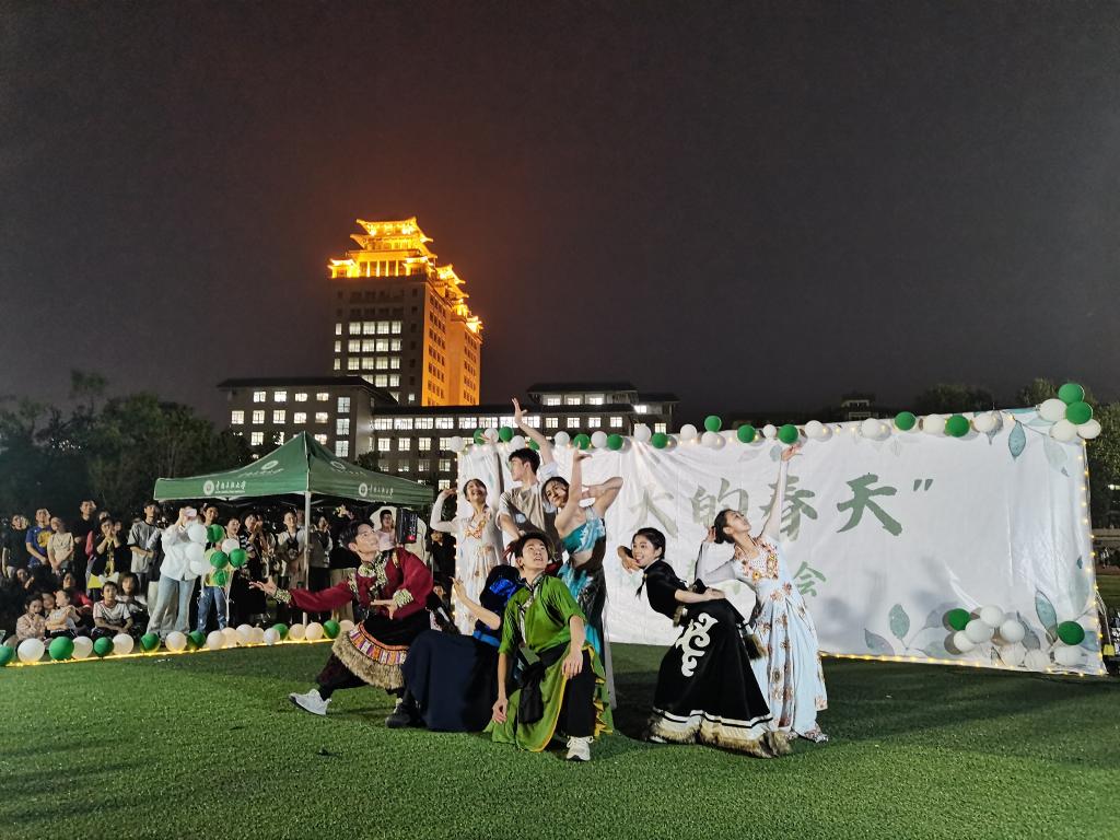 晚風拂過,南湖的落日格外美麗。春日晚會在觀眾的期盼中拉開序幕,一支街舞開場秀更是把觀眾熱情瞬間點燃。本次晚會包含歌舞類、語言類節目共19個,參演人數70余人。其中,經濟學院通過改編歌曲,將春晚“網紅”歌曲《上春山》和經典“神”曲《發如雪》融合在一起,引得觀眾贊不絕口。電子信息工程學院通過詩朗誦《我在一顆石榴里面看見了我的祖國》贏得全場觀眾共鳴。晚會中,同學們席地而坐,手牽手、肩并肩,就像石榴籽一樣緊緊團結在一起,盡情感受著春天里的民大。