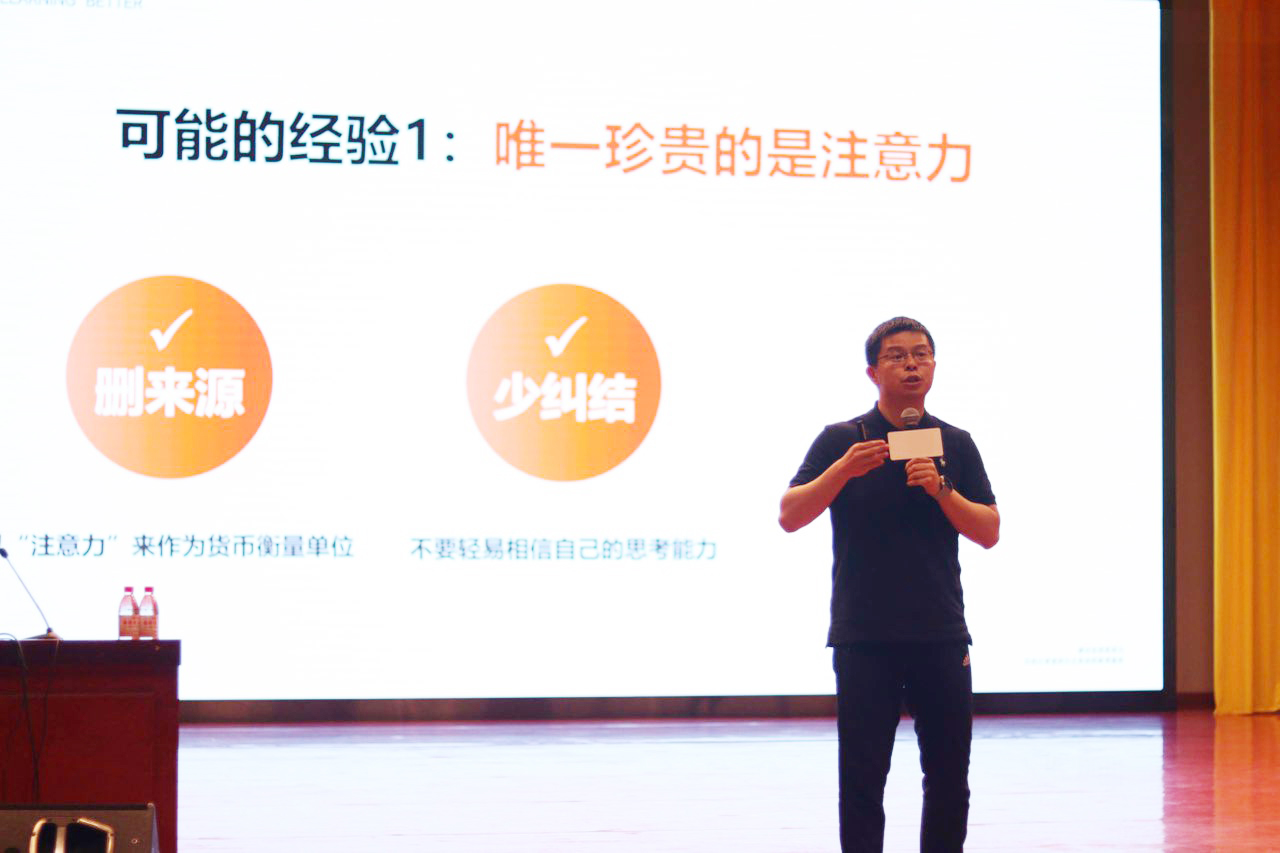 講座現場,劉文勇講述了自己兩次創業的經歷,分享了從創業經歷中所得到的經驗。他指出,集中的注意力、良好的身體素質、善于運用時間、保持高度緊張及終生學習這五點對于人生的成長缺一不可。