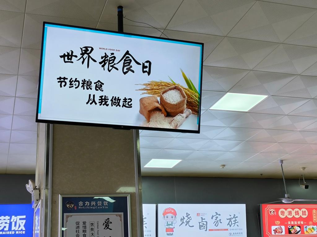 為使厲行節約、拒絕浪費的意識蔚然成風,飲食服務中心在各食堂用電視機滾動播放以“世界糧食日:節約糧食,從我做起”為主題的視頻,在食堂門外放置“珍惜糧食,從我做起”主題宣傳易拉寶,還運用公共場所的電子顯示屏滾動展示“糧安天下,共建美好生活,共創美好未來”等宣傳標語,提醒廣大師生節約糧食、愛惜糧食。