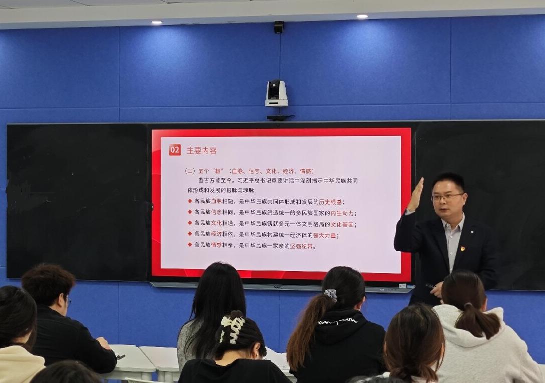 賀展從“兩個大局”的高度和“兩個結合”的深度來引導大家深刻理解鑄牢中華民族共同體意識是習近平總書記作出的重大原創性論斷,是馬克思主義民族理論中國化時代化的最新成果。他通過對比歷屆全國民族團結進步表彰大會盛況,來介紹學校中華民族共同體學院(研究院)被中共中央、國務院授予“全國民族團結進步模范集體”榮譽稱號的含金量。這不僅是榮譽,也代表著黨和國家沉甸甸的信任與責任。他還分享了在表彰大會中的見聞與感想,讓同學們深刻領會了習近平總書記在全國民族團結進步表彰大會上發表重要講話中蘊含的深刻道理。