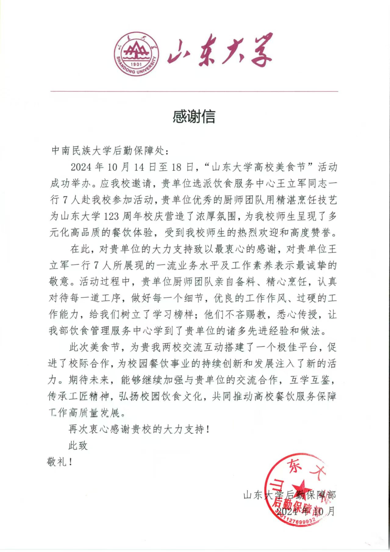10月29日,山東大學(xué)后勤保障部致信我校后勤保障處,感謝我校廚師團隊用精湛的烹飪技藝為山東大學(xué)123周年校慶營造了濃厚氛圍,為廣大師生呈現(xiàn)了多元化、高品質(zhì)的餐飲體驗。