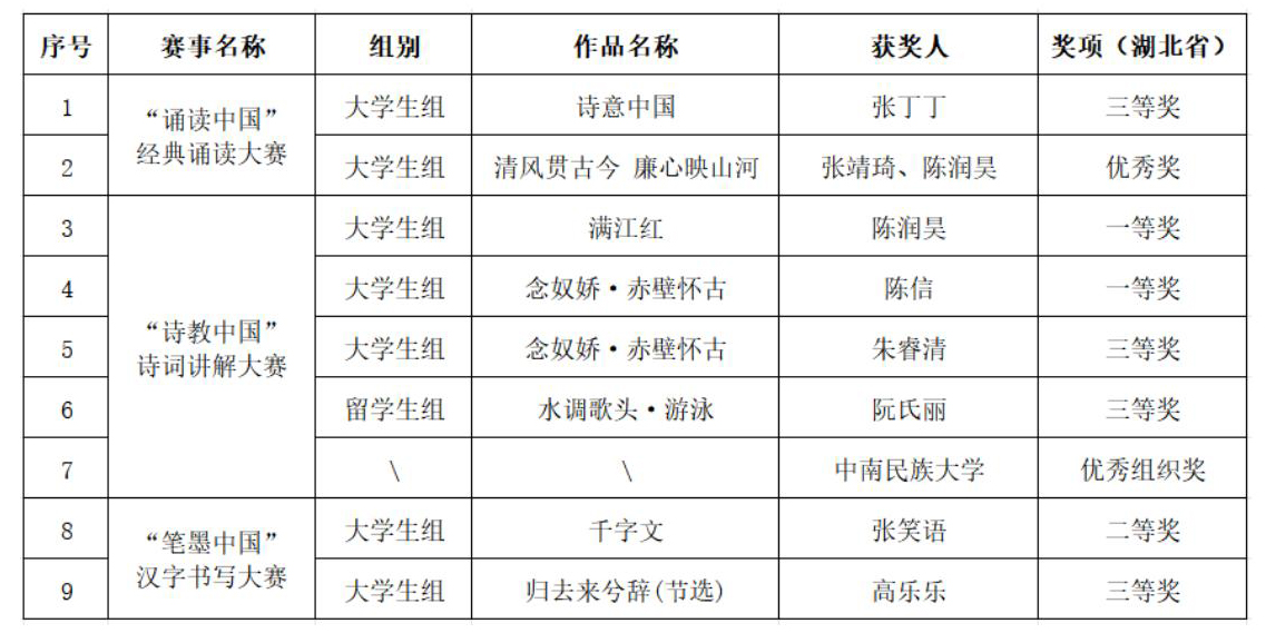 7月,湖北省教育廳辦公室公布第七屆中華經典誦寫講大賽(湖北賽區)獲獎名單,我校選送的作品在“誦讀中國”“詩教中國”“筆墨中國”三大賽事中斬獲一等獎2項、二等獎1項、三等獎4項、優秀獎1項,學校榮獲“詩教中國”賽事優秀組織獎,獲獎質量創歷史新高,全面彰顯了我校在傳承中華經典文化和語言文字教育領域的深厚積淀。