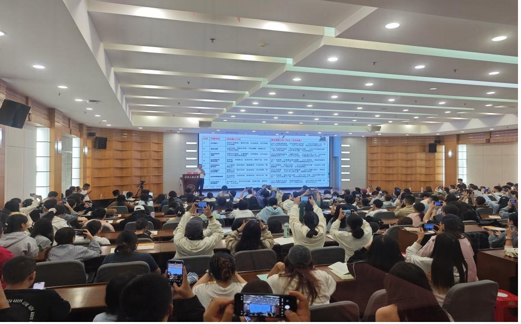 講座現場座無虛席,氣氛熱烈。講座開始前,覃瑞向夏曉華校友頒發就業教育指導“客座教授”聘書。隨后,夏曉華結合個人奮斗經歷與當前就業形勢,系統分析了新時代公務員職業的發展前景,并針對國考、省考、事業單位招聘以及“三支一扶”、西部計劃等不同招錄渠道,從考試難度、時間節點、備考策略等多個維度進行了專業解讀。