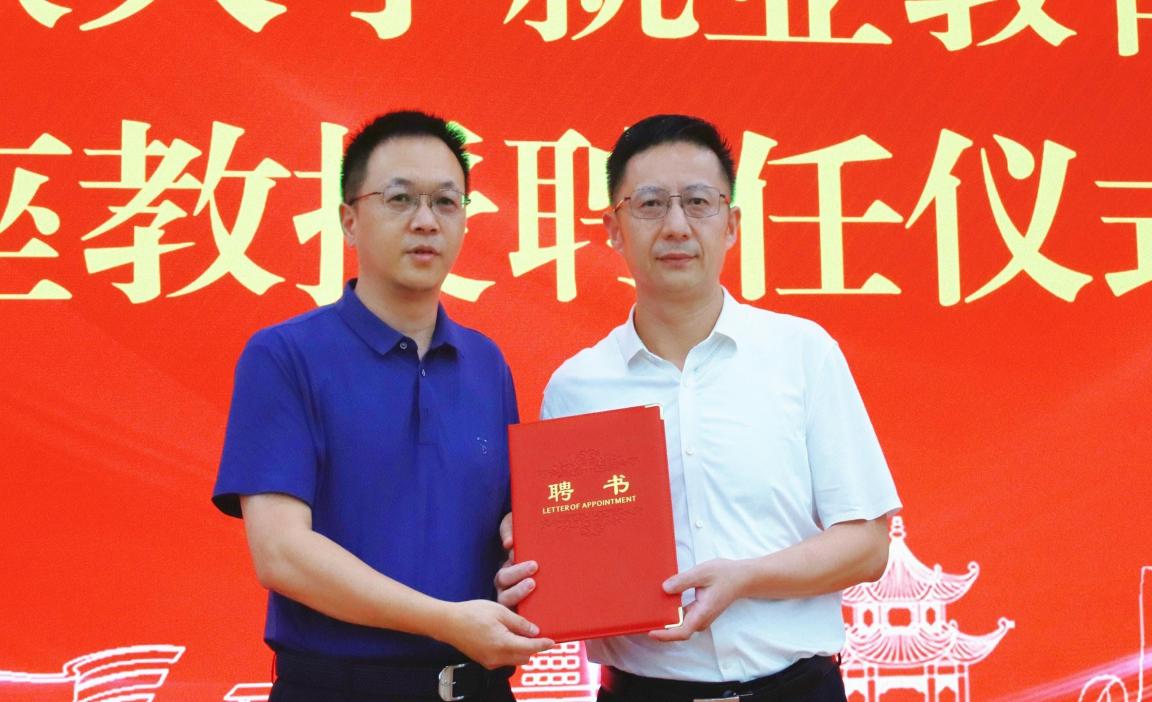 覃瑞向夏曉華頒發聘書。就業與校友工作處供圖