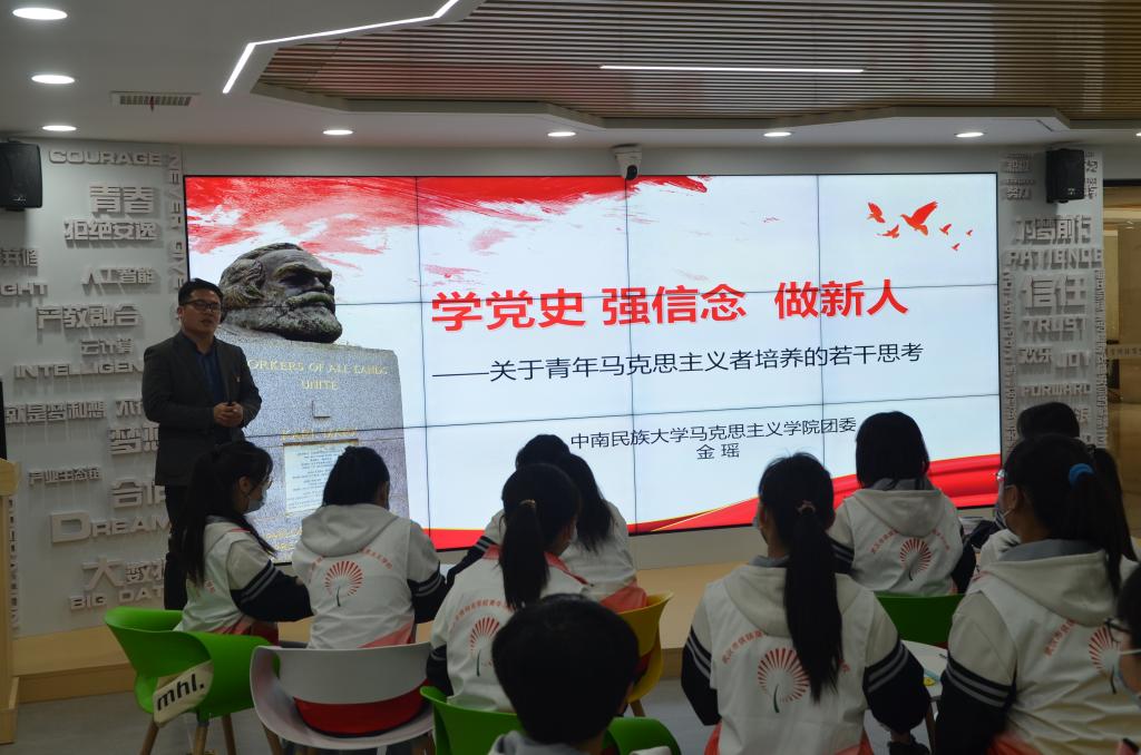 4月20日下午,我校馬克思主義學院團委書記金瑤及青年學生理論宣講團成員受邀前往武漢市供銷商業學校,參加該校“青年馬克思學校”第一屆“蒲公英”班開班儀式,并開展黨史宣講活動。武漢市供銷商業學校副校長鄢鳴、丁潔梅參加了活動。