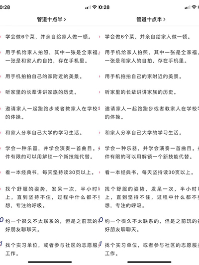 一些同學表示,21件“任務”簡單有趣,與大家的生活實際相關,也與社會發展相關,自己會努力發現生活中不平凡的點滴,找尋世界的精彩,珍惜韶華,不負時光,度過一個充實有意義的寒假。